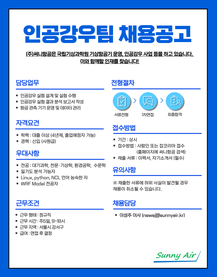 (주)써니항공 인공강우팀 채용공고