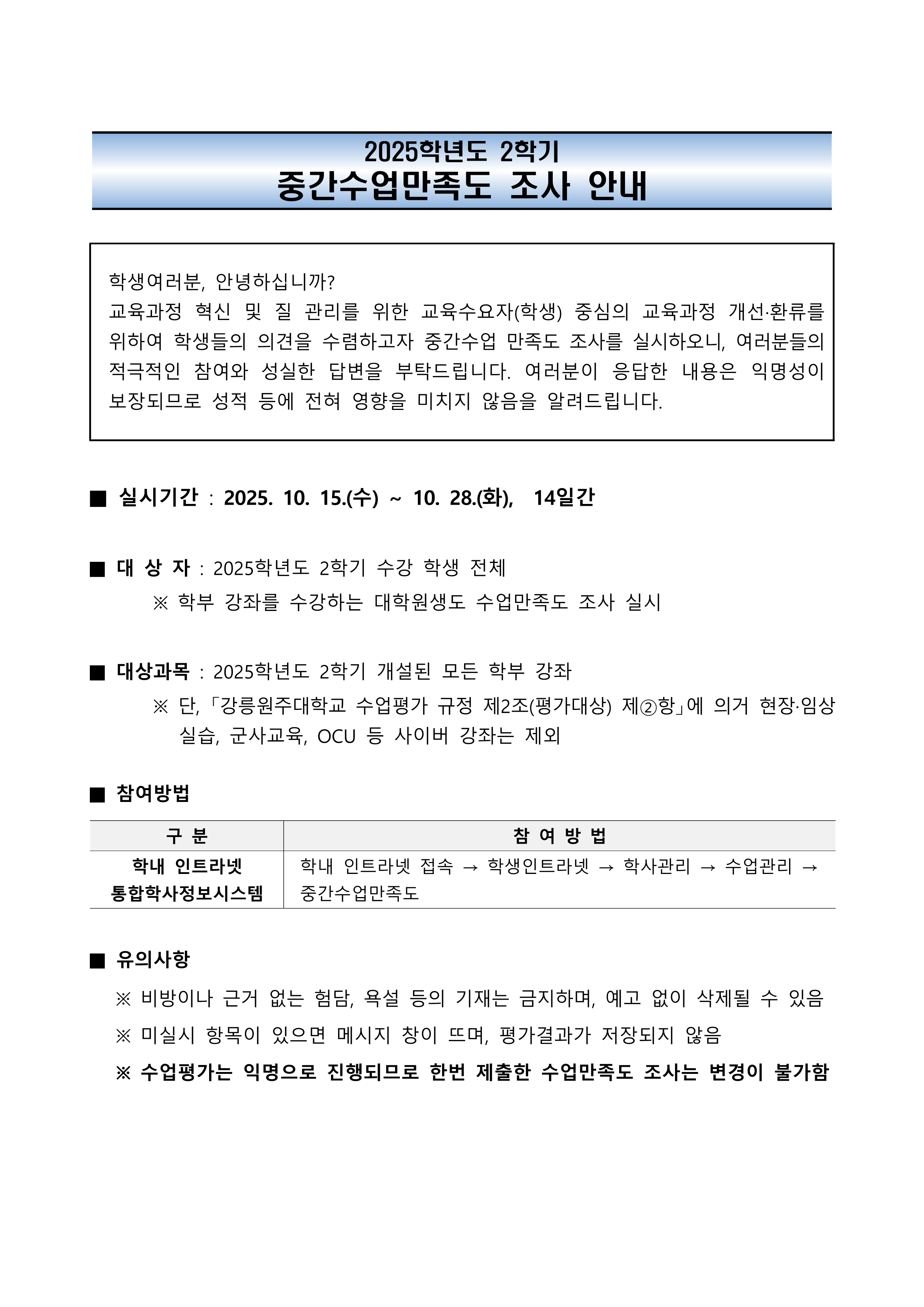 2025학년도 2학기 중간 수업만족도(수업평가) 조사 안내 및 협조 요청