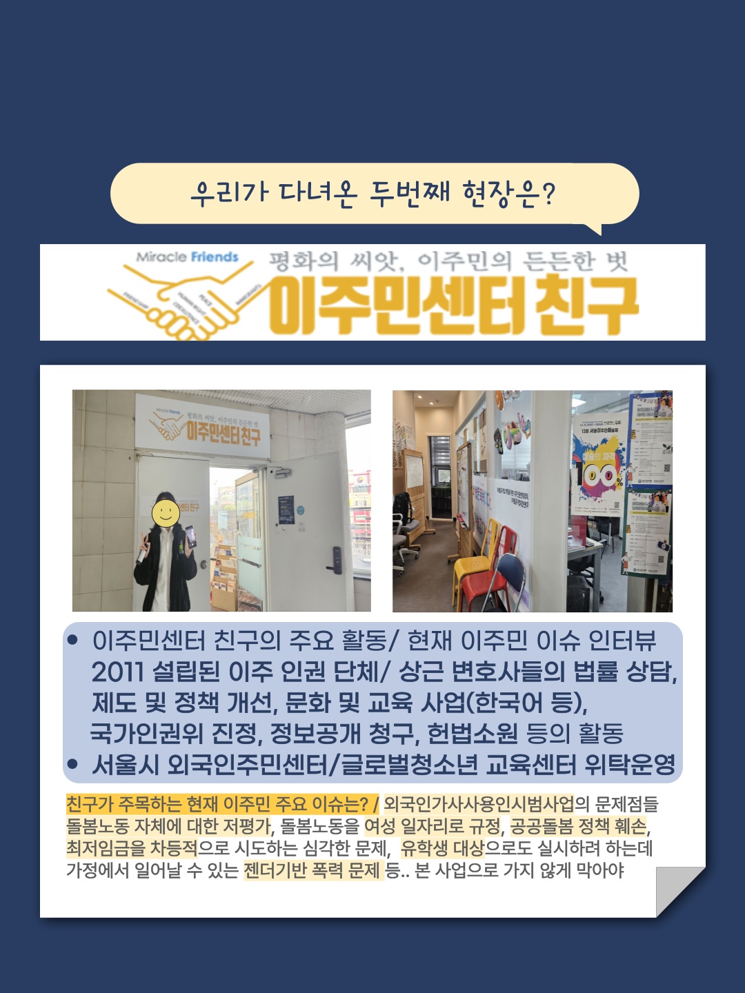 실습을 이주 인권 현장에서 하지 않는다면, 직접 경험하기 어려운 기회이니 모두 눈여겨 보시면 좋겠습니다 :)