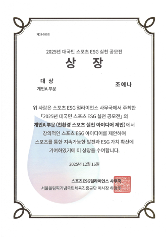 조예나 학생은 스포츠 ESG 얼라이언스 사무국이 주최한 이번 공모전의 개인 A 부문(친환경 스포츠 실천 아이디어 제안)에 참가해 대상 수상자로 선정됐다. 본 공모전은 스포츠를 통해 ESG 가치를 확산하고, 지속가능한 사회 발전에 기여할 수 있는 실천 방안을 발굴하기 위해 마련됐다.