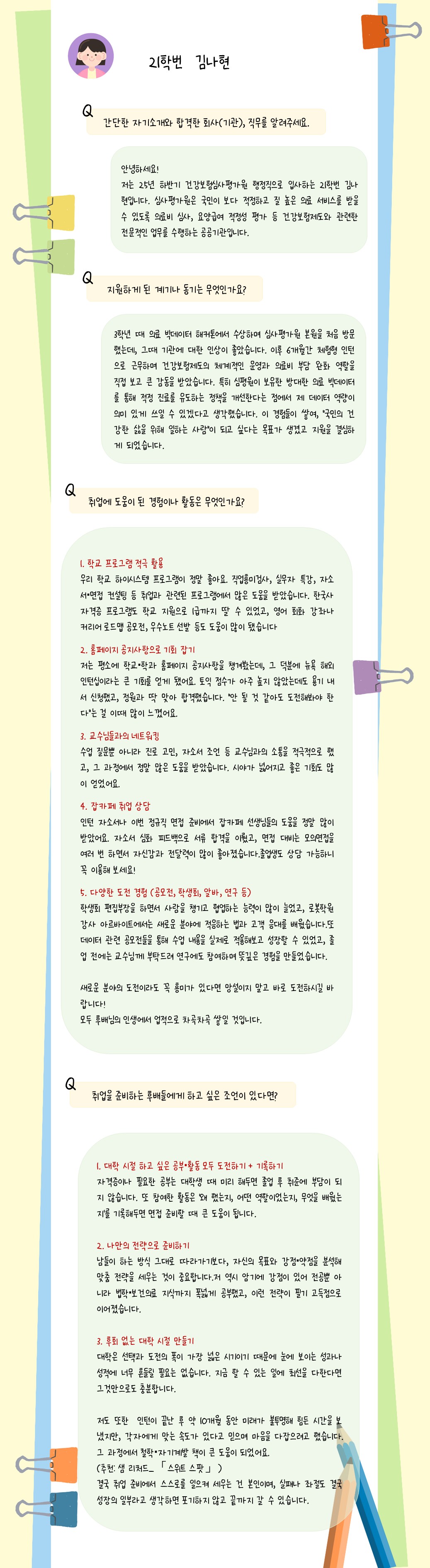 fnctId=bbs,fnctNo=242 [선배들의 취업 스토리] 21학번 김나현 졸업생 (건강보험심사평가원) 작성일 2025.12.11 작성자 데이터사이언스학과 조회수 544 “취업 고민하는 후배들을 위한 선배들의 진짜 조언” “취업 준비? 선배들의 경험담에서 답을 찾아보세요 :)” 첨부파일 첨부파일이(가) 없습니다.